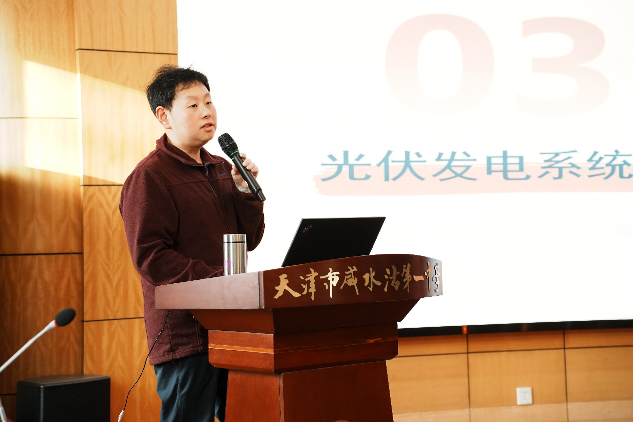 天津中德应用技术大学能源工程学院的陈老师作为咸水沽一中科学教育副校长,组织了此系统活动并承担了第一期讲座的主讲人。陈老师获物理电子学博士学位,在光伏发电领域有着深厚的学术造诣和丰富的实践经验。讲座中,陈老师从光伏发电的基本原理入手,深入浅出地介绍了太阳能如何通过光伏效应转化为电能,以及光伏发电系统的组成和工作流程。他还结合当前全球能源发展趋势,阐述了光伏发电在实现碳中和目标中的重要作用,强调了新能源技术对于应对气候变化和保障能源安全的关键意义。