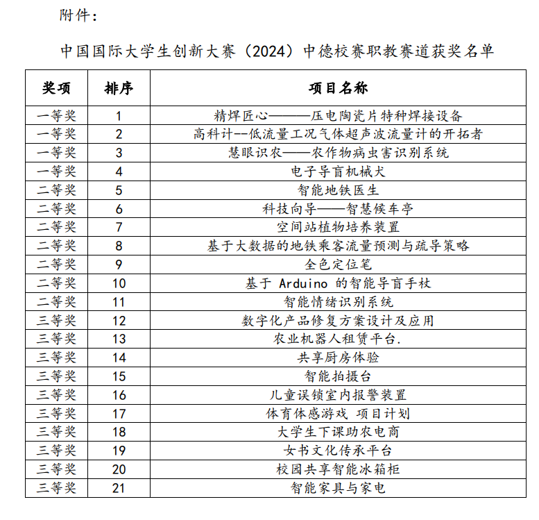 各参赛项目: 根据《天津中德应用技术大学中国国际大学生创新大赛(2024) 校赛实施方案》的安排,学校组织开展了中国国际大学生创新大赛 (2024)中德校赛路演评审活动。此次路演活动,共有 21 项职教赛 道项目进入路演评审环节。经过学校创新创业工作领导小组办公室组 织校外专家评审,按照 1:2:3 的比例设校赛一等奖、二等奖、三等奖, 评审结果见附件。 中国国际大学生创新大赛(2024)天津赛区比赛将根据市赛组委 会分配我校名额,按照评审成绩顺序分赛道依次推荐参加市赛。
