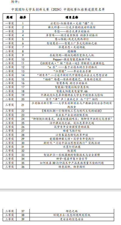 各参赛项目: 根据《天津中德应用技术大学中国国际大学生创新大赛(2024) 校赛实施方案》的安排,学校组织开展了中国国际大学生创新大赛 (2024)中德校赛路演评审活动。此次路演活动,共有 39 项红旅赛 道项目进入路演评审环节。经过学校创新创业工作领导小组办公室组 织校外专家评审,按照 1:2:3 的比例设校赛一等奖、二等奖、三等奖, 评审结果见附件。 中国国际大学生创新大赛(2024)天津赛区比赛将根据市赛组委 会分配我校名额,按照评审成绩顺序分赛道依次推荐参加市赛。